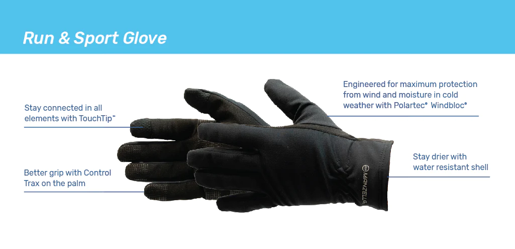 Men's glove designed for great fit and function. Stay connected while running or walking the dog with touch screen devices in cool weather conditions.