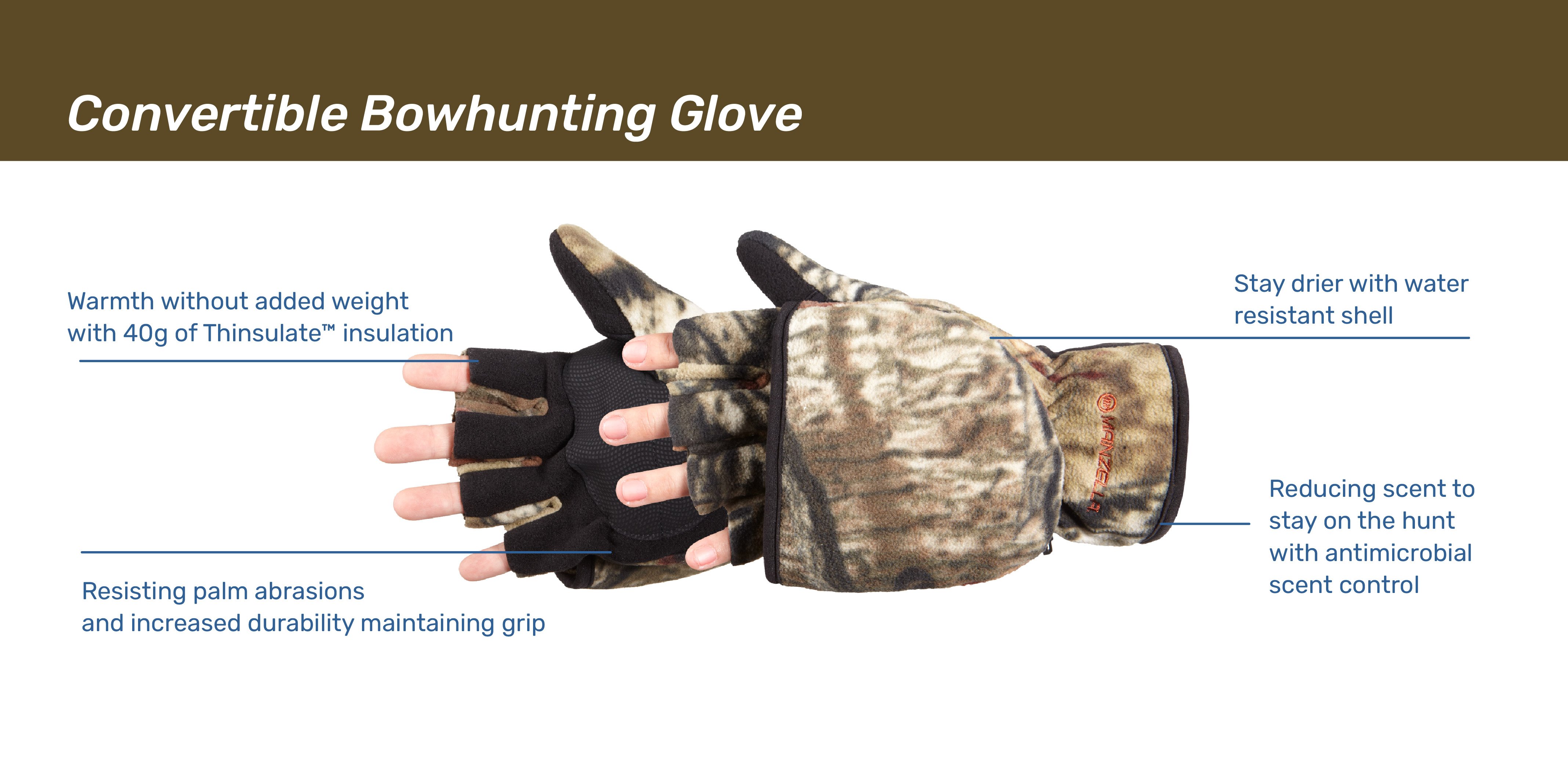 Insulated glomitt gives you the warmth of a mitten but converts to a half finger glove allowing better connection to your bowhunting gear quickly.
