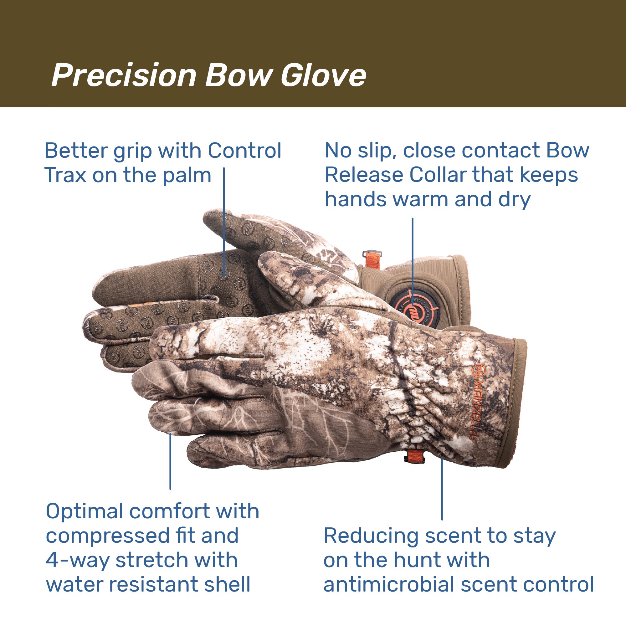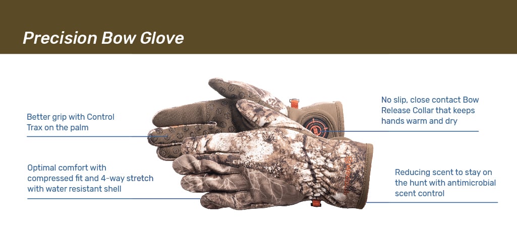 Ideal glove for the bow hunter. This precision fit bow hunting glove performs well under pressure with no slip, close contact collar.
