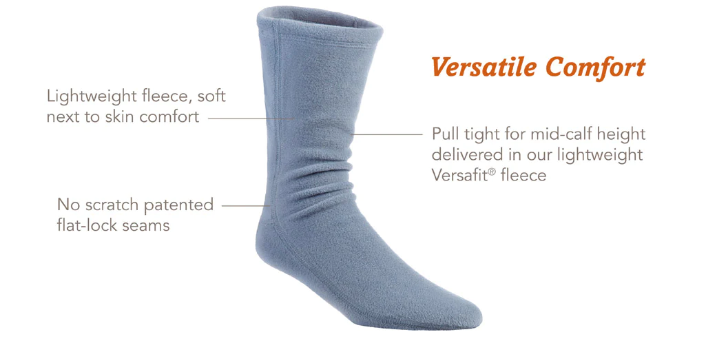 Designed to fit both men and women, Versafit Socks are a great alternative to wool. The breathable fleece construction keeps feet warm and comfortable, while a variety of classic patterns and solid colors offer simple, versatile style. The mid-calf length adds extra coverage for outdoor or indoor wear.