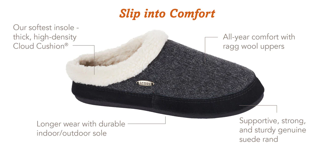 At the heart of this indulgence lies our Cloud Cushion® multilayer insole—superior to memory foam in both recovery and durability. Sink into its plush support and discover Acorn’s softest, most luxurious footbed ever. The result? A slipper that feels like a treat, every single wear.
