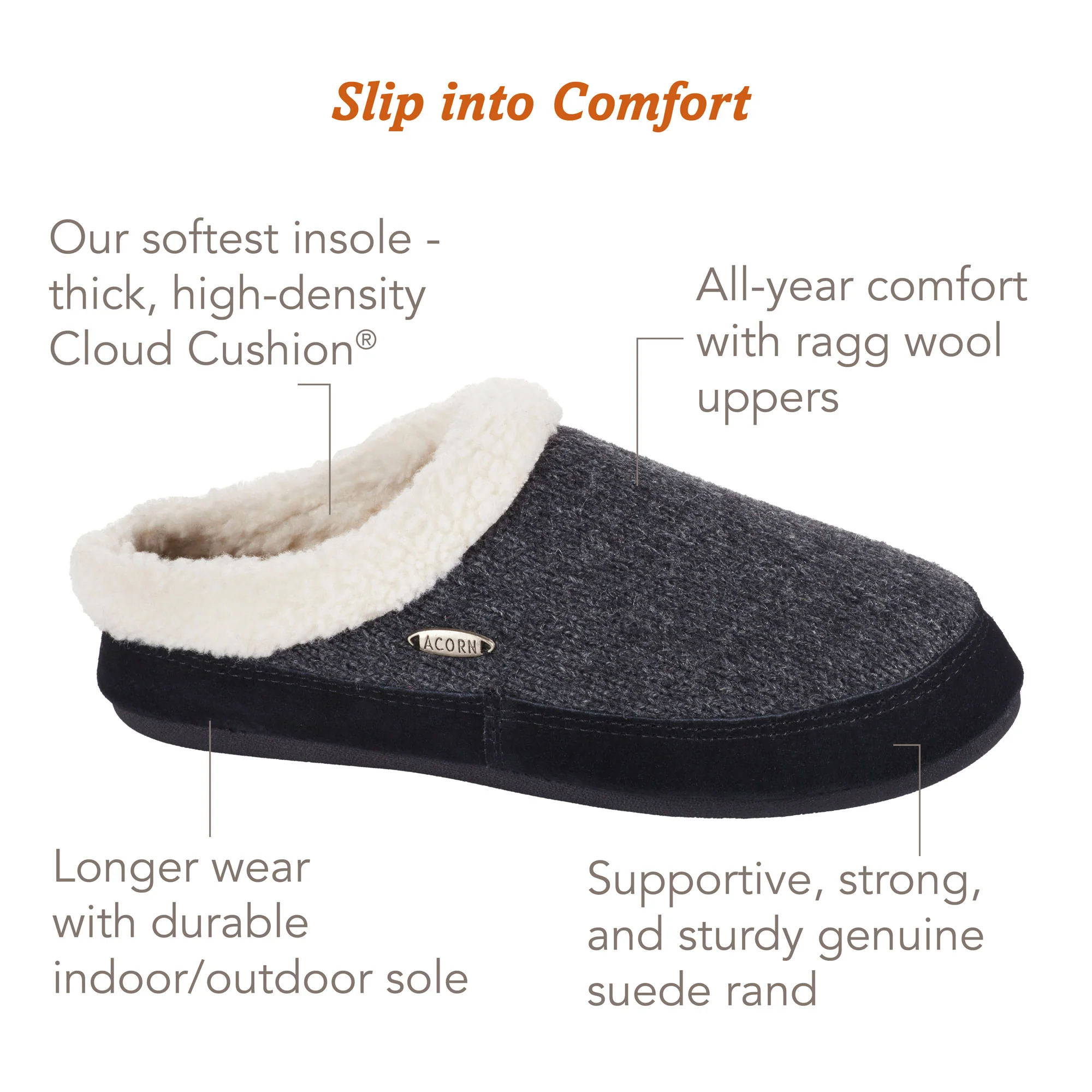 Cloud Cushion® features a sophisticated insole, crafted with several layers of premium cushioning for exceptional, enduring comfort — a signature innovation found in Acorn slippers.